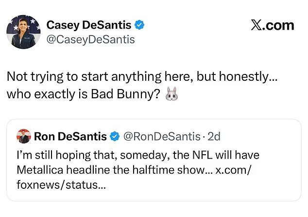 O ex -crítico de Trump, Dessantis, fez uma objeção específica ao mau bani em um material de língua espanhola acima de 1,5 milhão. Em vez disso, ele só pediu à sua banda favorita que tivesse a oportunidade de tocar no intervalo no Super Bowl.