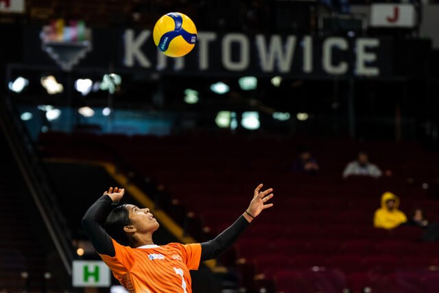 O oponente da Nikki Kimari, nº 7 da Índia especial, a Namíbia Olímpica Especial, na partida de abertura de sua Copa do Mundo de Vôlei Olímpica Especial Polônia 2025.