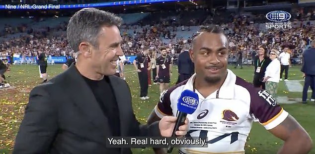 Ezra Mum (ilustrada, à direita, com Brad Fitler) esqueceu que ele estava ao vivo no canal nove no domingo à noite, quando Bhai estrelou vários explica durante uma entrevista à lenda da liga de rugby, Brad Fitler
