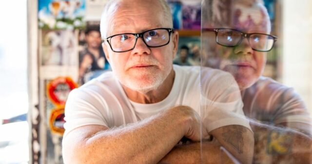 Freddy Roach tocou uma camiseta enquanto posava para uma foto de sua coleção de clubes de boxe Wild Card.