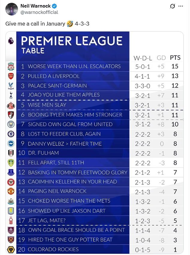 A derrota por 3-1 no fim de semana significa que o 14º na tabela United, no United e Warnock, respondeu um post que listou equipes em uma ordem posicional com nomes ou dores alternativos.