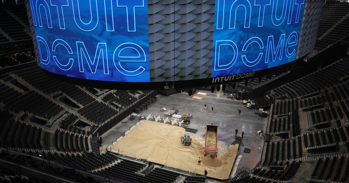 1 Um dos muitos caminhões viaja pela cúpula intuita para fornecer areia para a preparação do evento da Liga AVP. 2 Os trabalhadores cobrem lentamente o chão da cúpula íntima com areia. (All J. Skaben / Los Angeles Times)