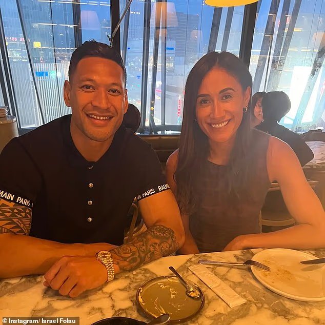 Israel Folau reaparece de surpresa em um campo de treinamento de Wallabies no Japão (foto com sua esposa Maria)