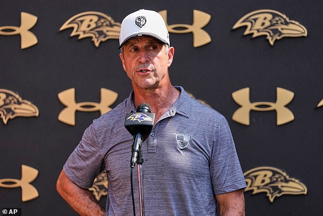 Falando a repórteres no campo de treinamento inaugural de Baltimore Reven na quarta -feira, o técnico John Harbah se opôs à formação de uma pergunta com o presidente do recente escritório oval de sua família.