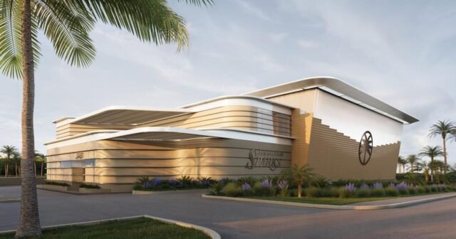 Uma renderização parece externa para as instalações futuras de treinamento e prática de faíscas em El Segundo.