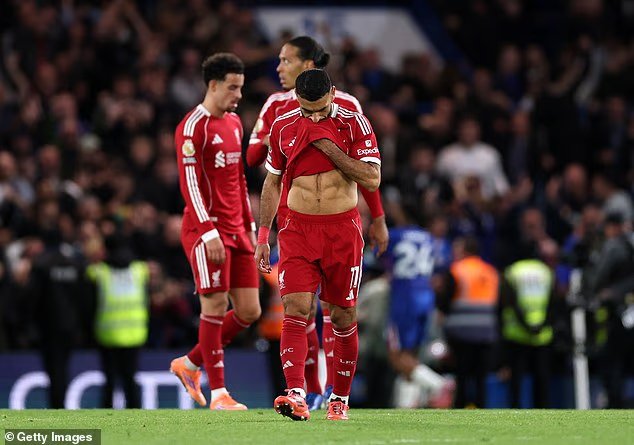 Mohammed Salah lutou durante a dramática derrota tardia do Liverpool em Chelsea no sábado