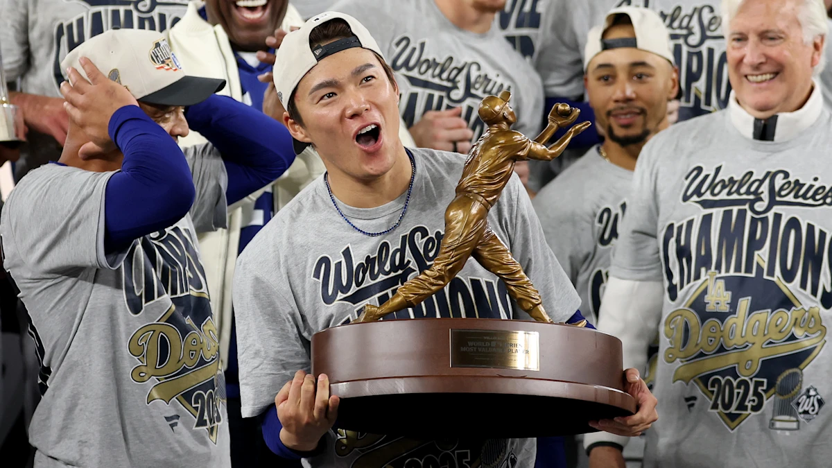 Yoshinobu Yamamoto, do Los Angeles Dodgers, ganhou o prêmio Willie Mays de Jogador Mais Valioso da World Series após derrotar o Toronto Blue Jays. O Getty