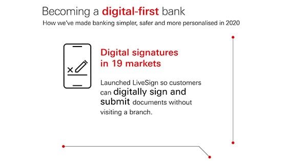 Milhões de clientes em todo o mundo retornaram aos nossos canais digitais para fazer seus bancos. Por exemplo, o preço do pagamento móvel em todo o banco aumentou de 220 % para abril a junho de 2020 em comparação com o mesmo período de 2019. Downloads do nosso aplicativo móvel HSBCNET para clientes corporativos aumentaram 155 % nos primeiros nove meses do ano.