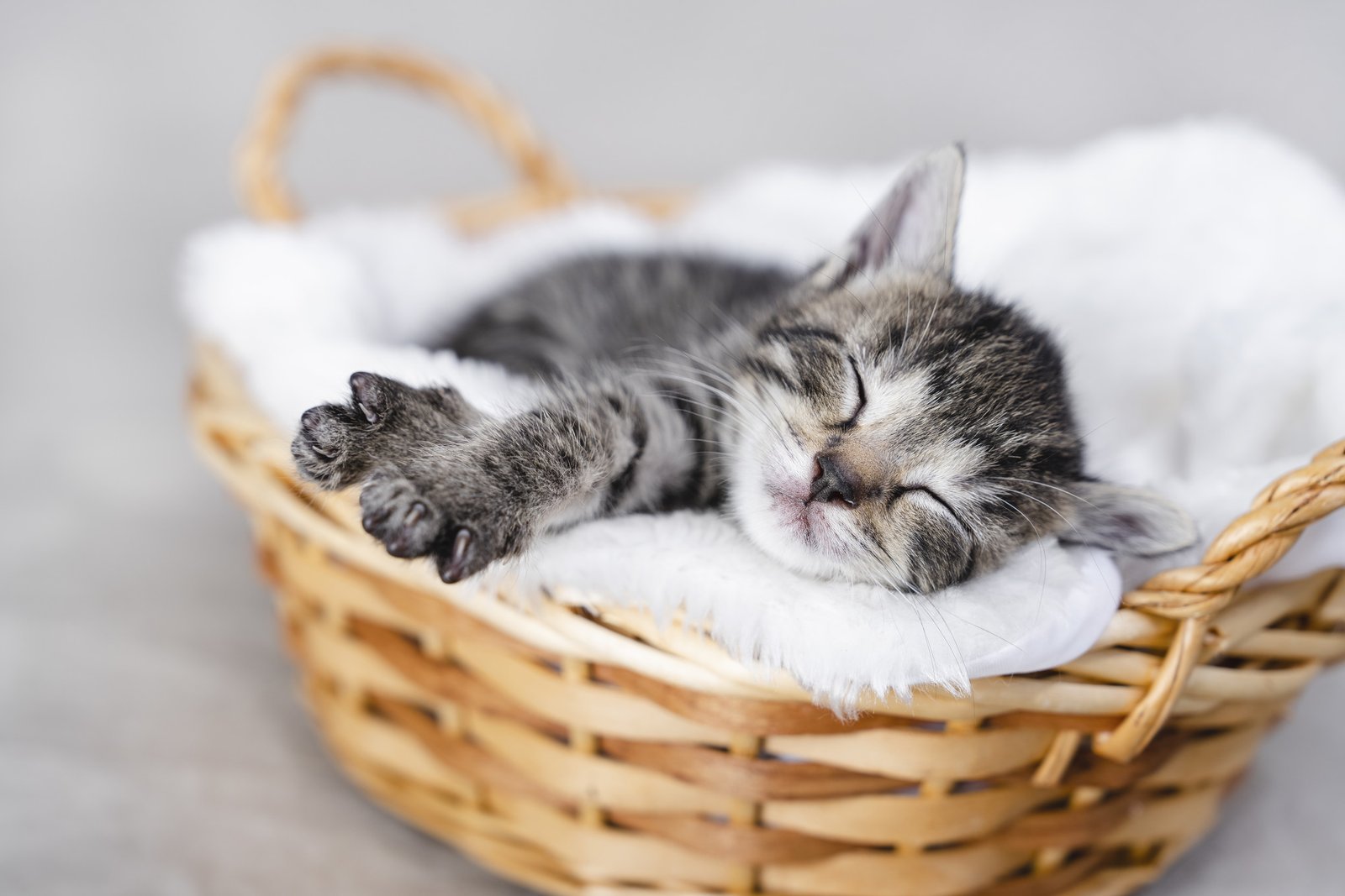 Imagem do estoque: Um gatinho dorme em uma cesta de tecido.