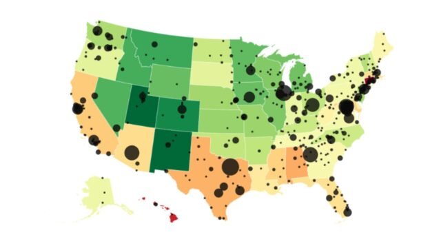 Quando mapeado Newsweek, Os dados mostram que o data center está presente em todos os Estados Unidos. O estado com os centros mais baixos é o Alasca, com 4, enquanto o estado é a Virgínia, que tem 63635.