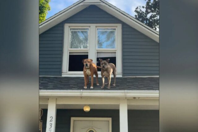 De volta para casa do trabalho, uma mulher parou no caminho quando estava assistindo seus dois cães de lugares inesperados: do telhado.