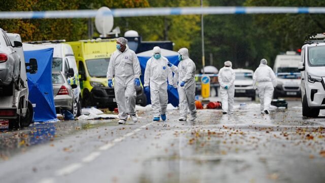 Um oficial forense, Hiton Park, está trabalhando no local de um sinagogue esfaqueado no congolês hebraico, Manchester, na Inglaterra, sexta -feira, 3 de outubro de 2025, o ataque ocorreu na quinta -feira.