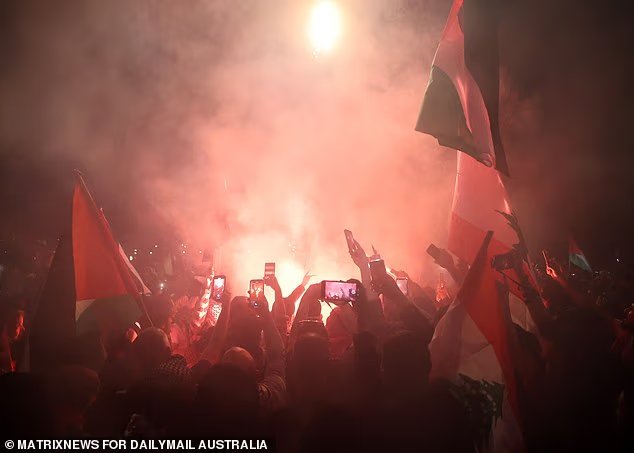 Os manifestantes estão indignados com a decisão do governo do estado de NSW em 2021 de acender a bandeira de Israel após o ataque de outubro de outubro.