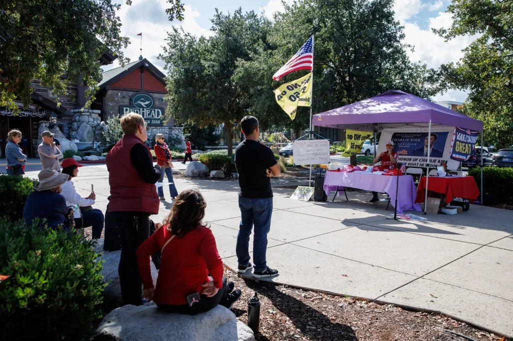 O republicano Max Hosia e cerca de uma dúzia de seu grupo South Bay Patriots se reuniram no estacionamento do Pro Shop em San Jose, vestiram seus chapéus vermelhos MAGA, penduraram suas placas “Não à Proposta 50” em uma tenda pop-up e tentaram encorajar um debate no estilo Charlie Kirk “prove que estou errado”.