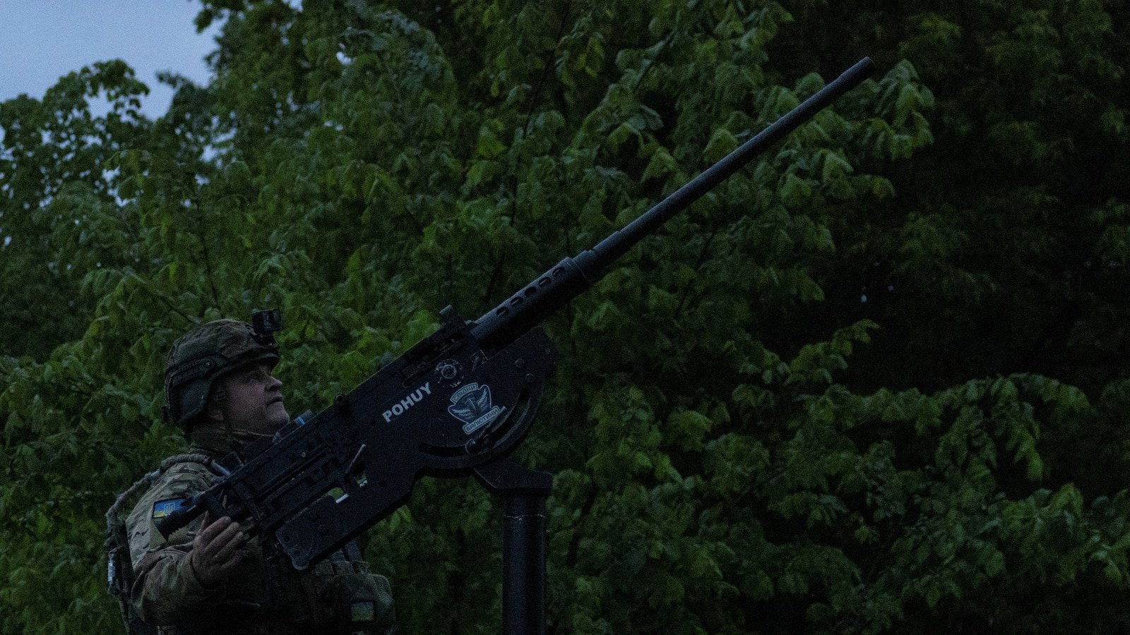 Em 18 de maio de 2025, um membro de uma unidade voluntária de defesa aérea móvel fica ao lado de uma metralhadora durante o ataque de drones russos na região de Kiev, na Ucrânia.