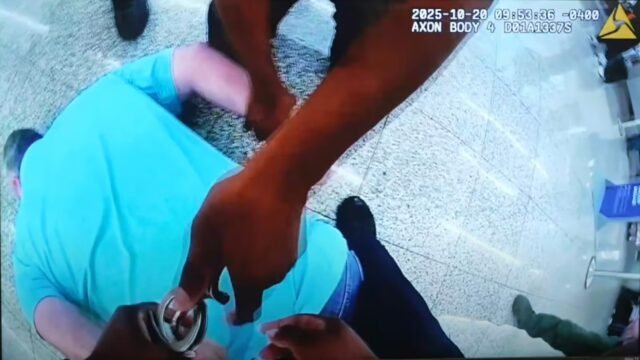 Imagens da câmera do corpo policial de uma prisão no Aeroporto Internacional Hartsfield-Jackson Atlanta são mostradas durante uma coletiva de imprensa em 20 de outubro de 2025.