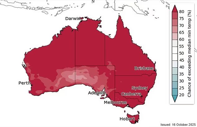 Espera-se que a Austrália sofra um verão excepcionalmente quente. A figura é um mapa que mostra a probabilidade de ultrapassar a temperatura mínima média nos três meses a partir de janeiro