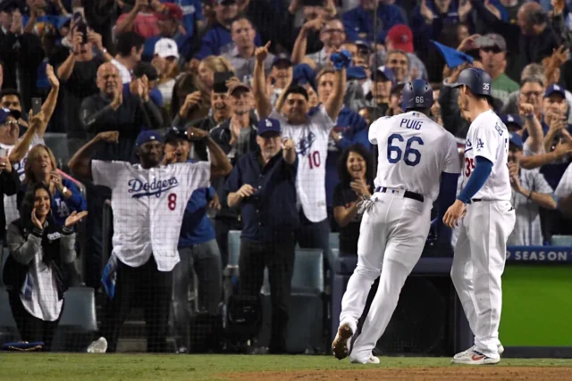Kobe Bryant comemora depois que Yasiel Puig fez um home run de três corridas na sexta entrada do jogo 4 da World Series 2018 contra o Boston Red Sox. (Foto de Kevork Zancejian/Getty Images)