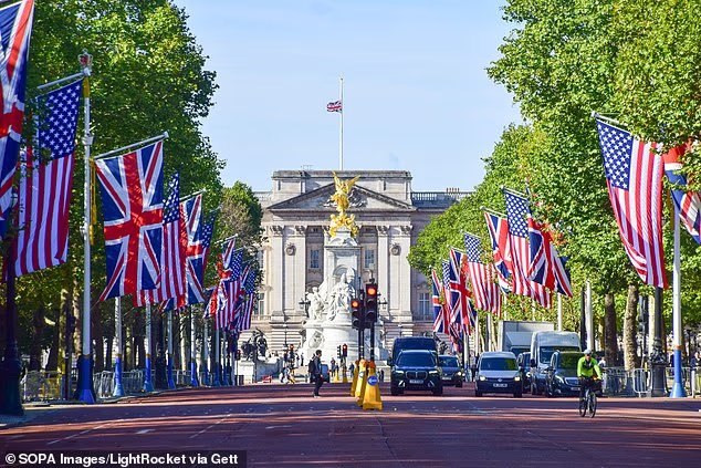 Flags e bandeiras da American e Union Jacks classificaram o shopping para ir ao Palácio de Buckingham antes da visita do estado de Donald Trump no mês passado