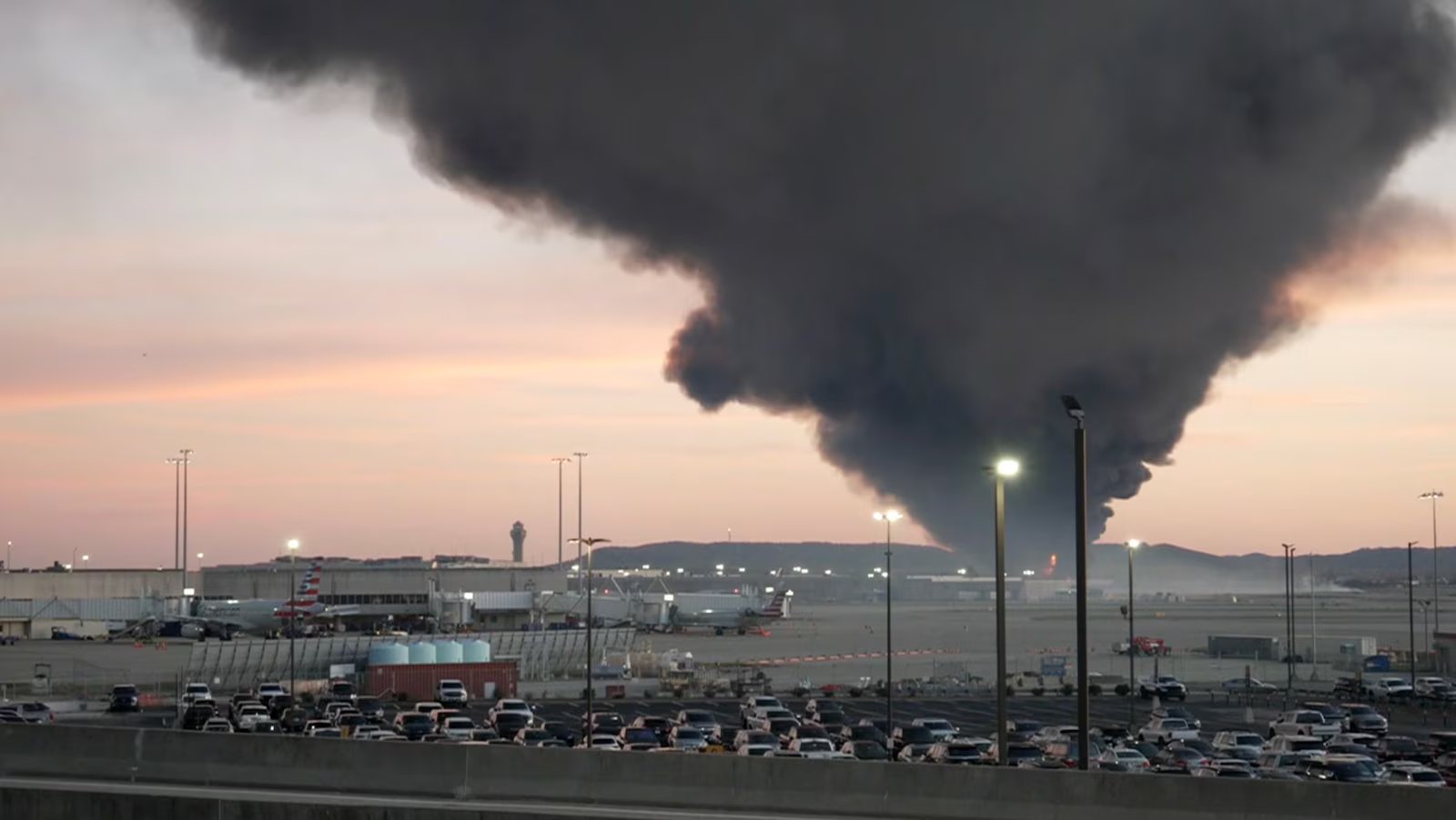 Uma grande nuvem de fumaça pôde ser vista perto do aeroporto, que está fechado, segundo a FAA.