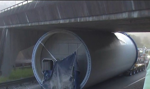 A enorme parte da turbina aérea está presa sob a ponte, causando um grande obstáculo a