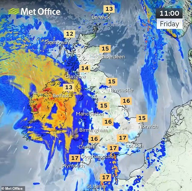 “O vento mais poderoso é provavelmente algumas partes da Escócia Norte e Oeste, onde as rajadas são possíveis mais de 90 milhas por hora – é coberto por um aviso separado de âmbar para o período de sexta -feira à noite.”