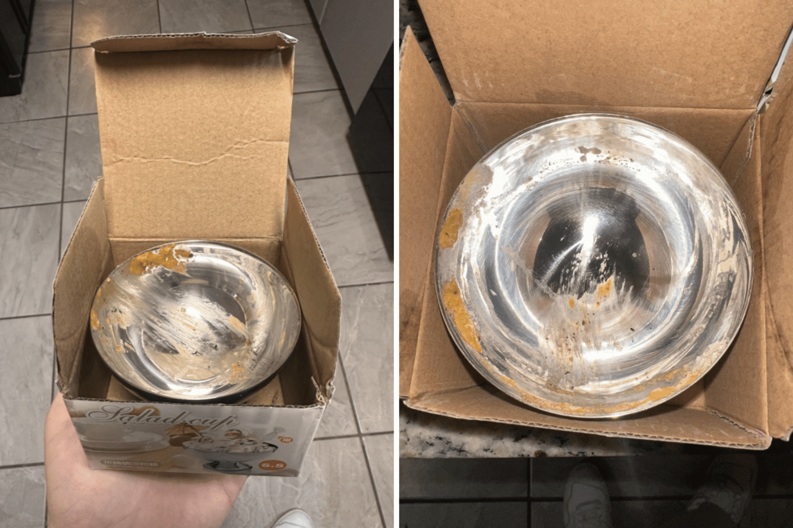 Explicação do trabalho Newsweek: “Minha noiva e eu pedimos essas tigelas de um pequeno fornecedor chinês na Amazon, eles tinham uma média de 4,7/5, mas apenas em 20 críticas. Foi bom o suficiente para nós e deixamos o pedido.