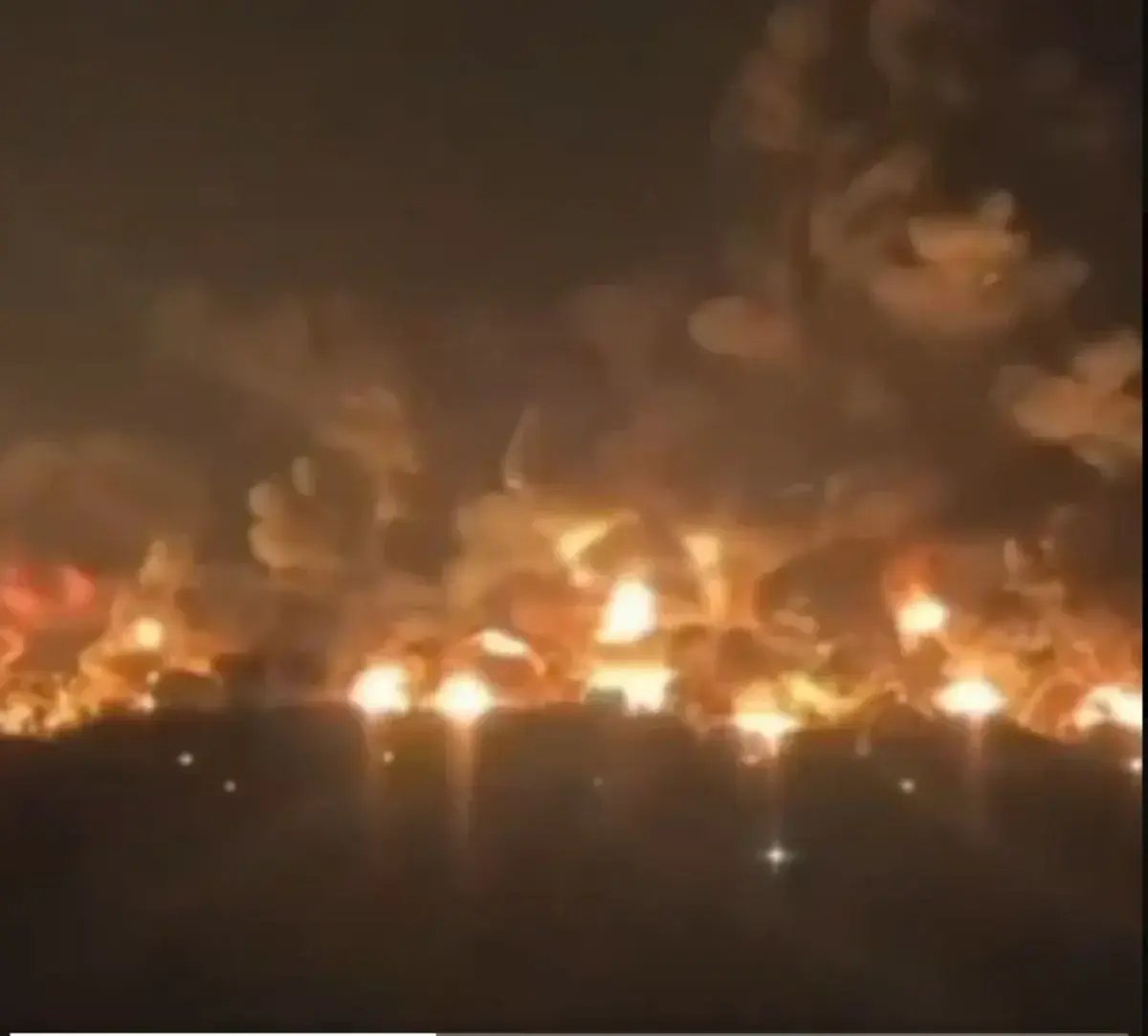 Uma enorme fumaça preta densa e ardente vinda do depósito em vídeos postados nas redes sociais.