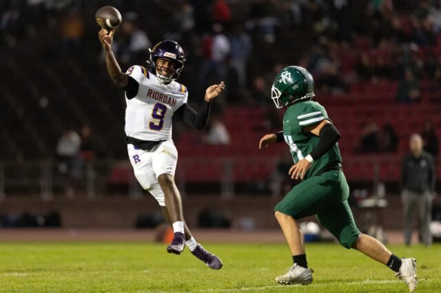 Brown completou o passe para empurrar seus jardas totais em dígitos triplos – e fazer o bem em favor do técnico de basquete da Riordan, Joe Carten.