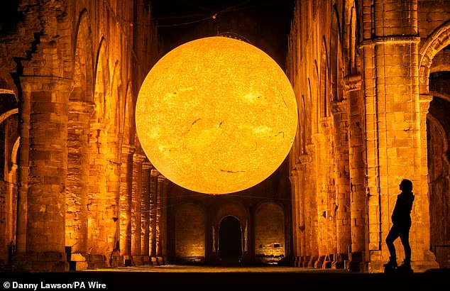 O artista Luke Jaram Fountains está embaixo da enorme escultura de seu sol na abadia da fonte