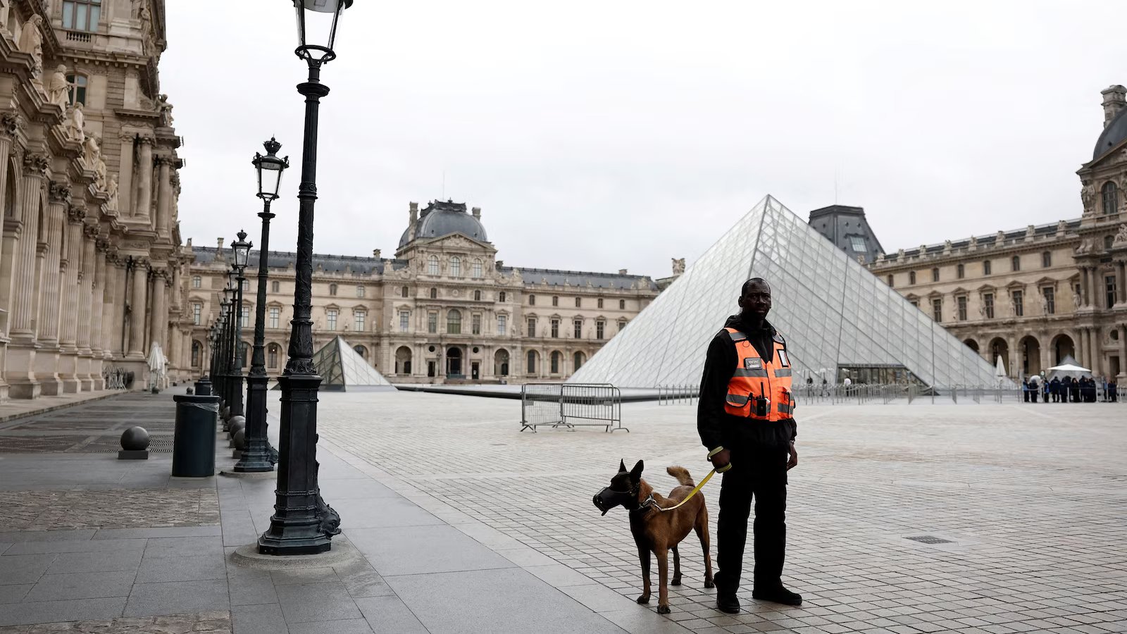 Um guarda de segurança com um cão está perto da pirâmide de vidro do Museu do Louvre enquanto o museu permanece fechado no dia seguinte a um espectacular roubo de jóias por ladrões que usaram uma grua para entrar no monumento e partir uma janela do andar superior, roubando jóias de valor inestimável de uma área onde a coroa francesa, a coroa de França, negociou, negociou, negociou, negociava em Outubro. 20, 2025.