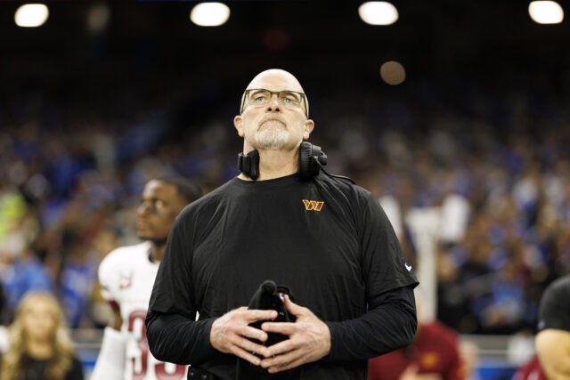 O treinador principal dos comandantes de Washington, Dan Queen, é em 18 de janeiro de 2025 contra o Ford Field contra o Detroit Lions no jogo da divisão da NFC -enquanto joga no hino nacional … O treinador do Washington Commanders, Dan Queen, está no Detroit de Michigan em 18 de janeiro de 2025 contra o jogo da divisão da NFC contra o Detroit Lions em Ford Field.
