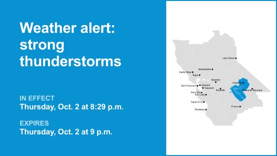 “Às 17:20, um poderoso Thunderbolt no Doppler Radar Bootzack ou Yosemite se moveu para o nordeste a nordeste da entrada sul da entrada sul, 48 quilômetros por hora”. Ele é Hanford CAO “leve granizo da planta é possível”.