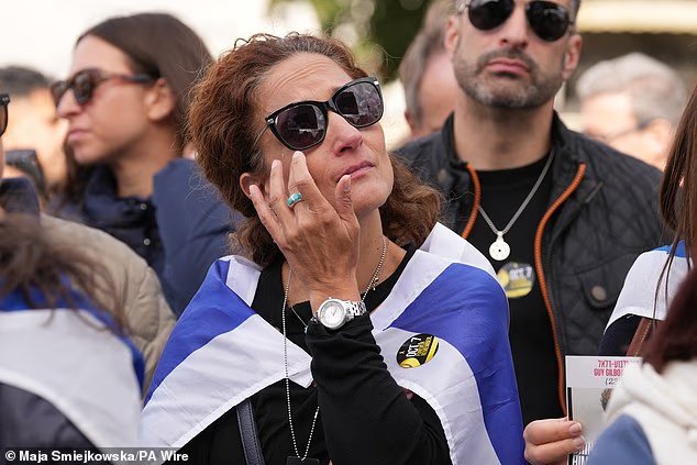 Uma mulher curvou -se durante o comício dos judeus na Trafalgar Square, em Londres, e fechou os olhos