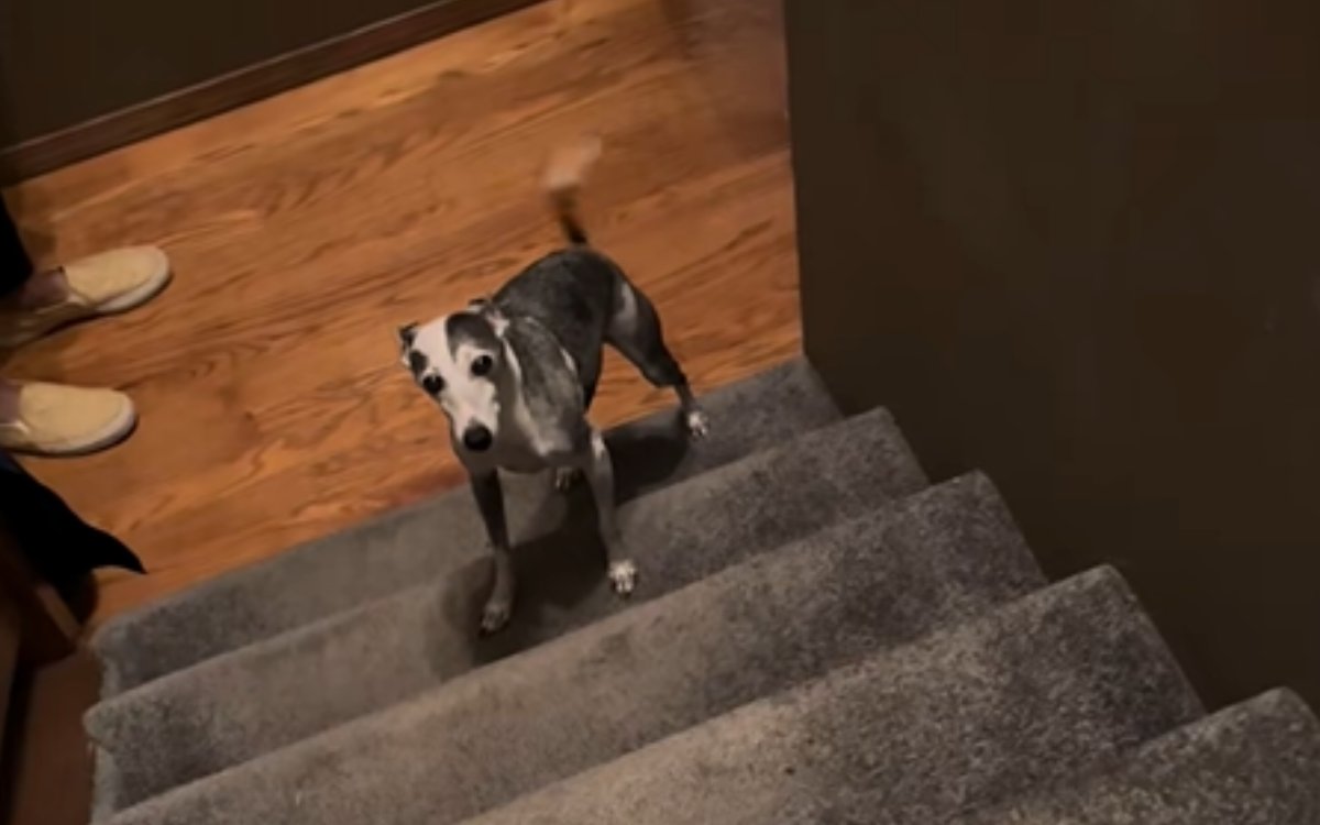 Um cachorro da família está adotando uma abordagem diferente ao subir e descer escadas após um infeliz incidente na casa de um parente.