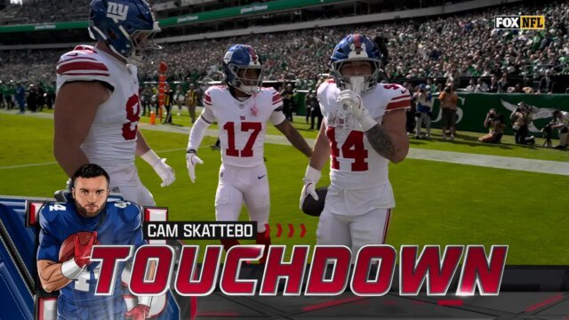Jackson Dart, do New York Giants, se conecta com Cam Scottebo para um caça-tanques de 18 jardas, jogo contra o Philadelphia Eagles.