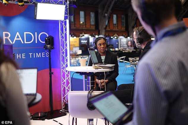 Broadcast Studios na Conferência Conservadora em Manchester, reproduzido em uma pesquisa de Cemie Badenoch que abordou que cerca de dois terços dos membros apoiariam um acordo