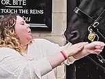 Veja o momento em que o vigia de um rei fica muito perto da guarda do rei. O animal foi retratado nos braços da mulher enquanto posava para uma foto no Whitehapan, em Londres.