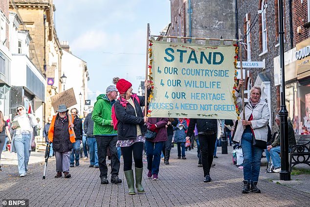 Os manifestantes carregavam faixas para ‘construir, precisávamos de casas, casas para a ganância’ e ‘salvar nosso campo’.