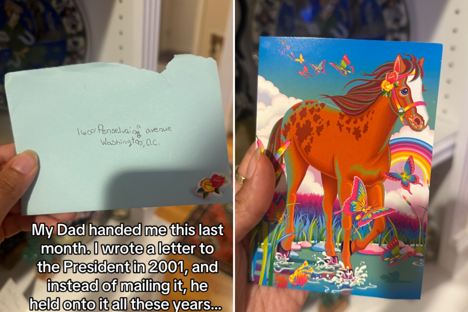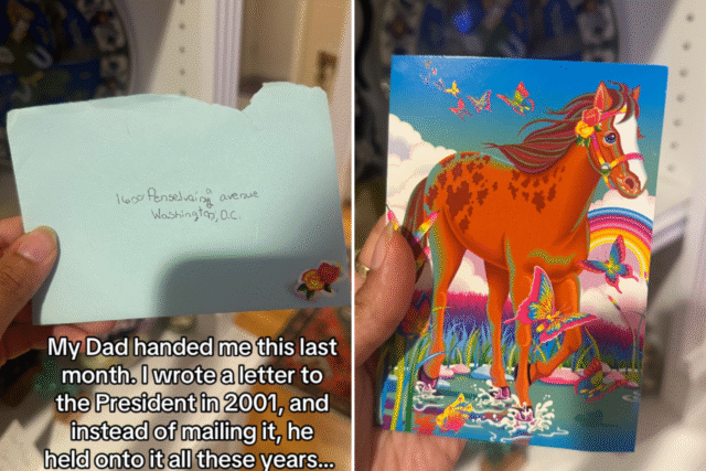 Acontece que o pai do outono está segurando o cartão manuscrito desde então. Recentemente, ele o devolveu, dentro do envelope branco dirigido à “1600 Pennsylvineia Avenue”. Um desenho animado com borboletas rosa no cartão apresenta um arco -íris no fundo – a qualidade de enviar qualquer líder mundial.