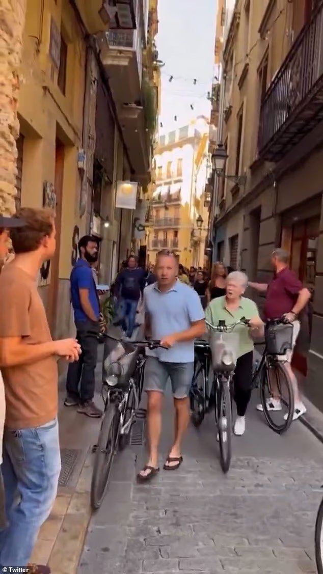 Este é o momento tenso em que os espanhóis cercam os turistas e gritam aos turistas que andam de bicicleta para “saírem” depois de se aventurarem nas ruas pedonais.