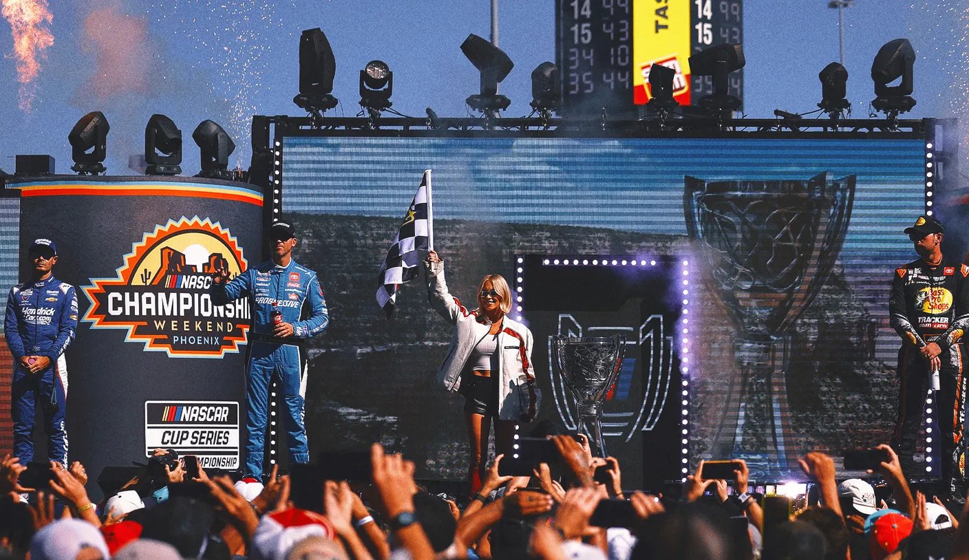Kyle Larson comemora após vencer o campeonato NASCAR Cup Series de 2025 em Phoenix.