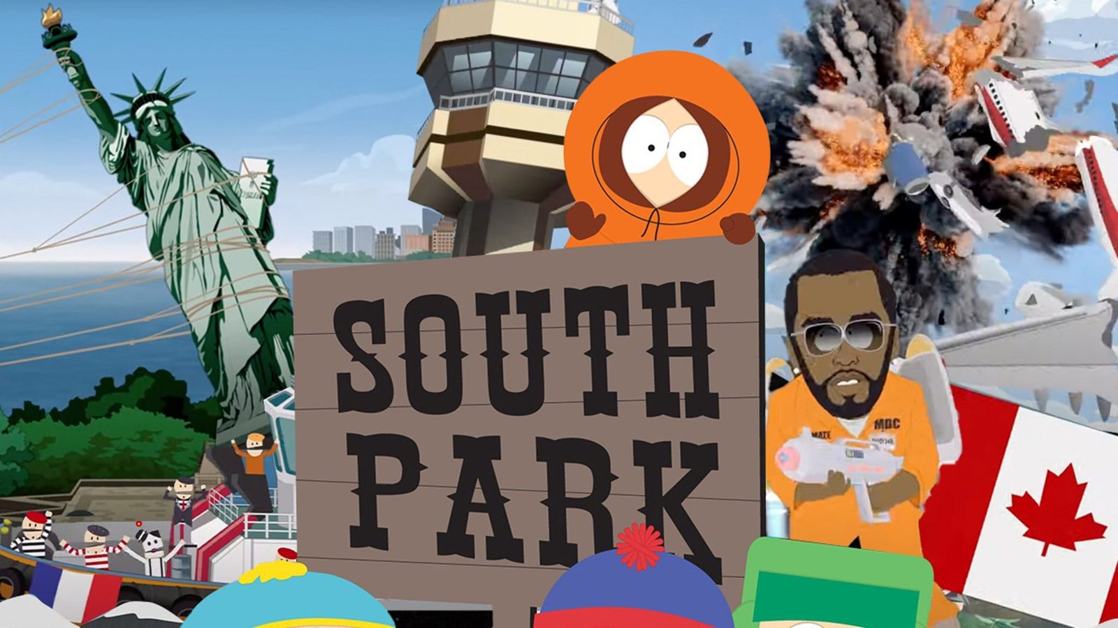 Tiro em South Park, Colorado – a cidade fictícia onde o tiro é ação – um barco de fogo e um francês para superar a estátua da próxima colheita da liberdade … antes do show dar um grande balanço, paródia da raiva American Airlines cai De janeiro