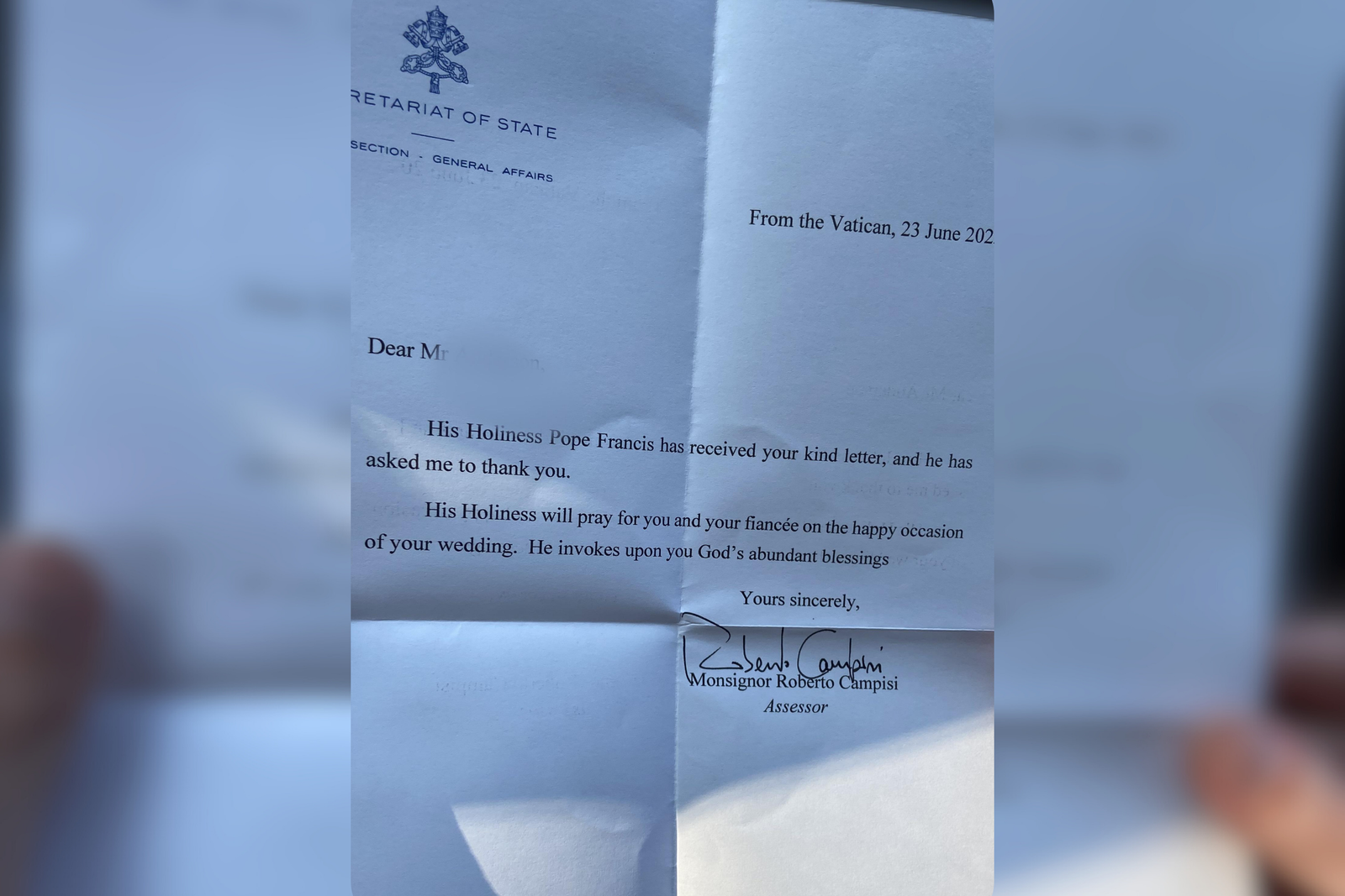 Em resposta ao convite de casamento de Ian, a carta do Vaticano para o falecido papa Francisco.