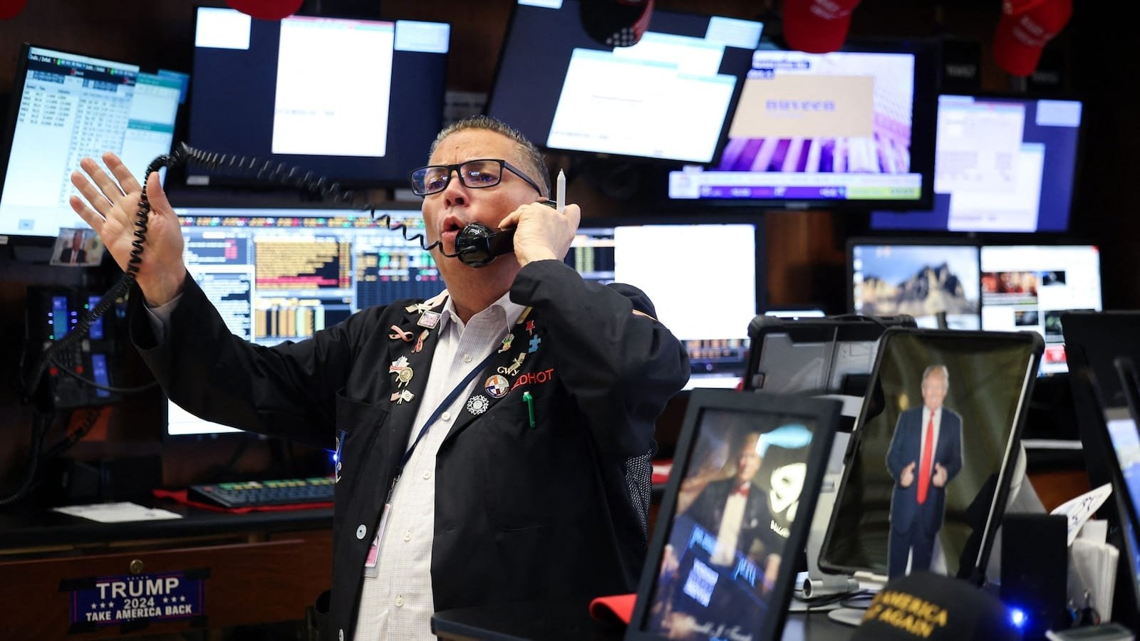 Um empresário falou ao telefone enquanto trabalhava no andar da Bolsa de Nova York (NYSE) no sino de abertura em Nova York em 1º de abril de 2025.