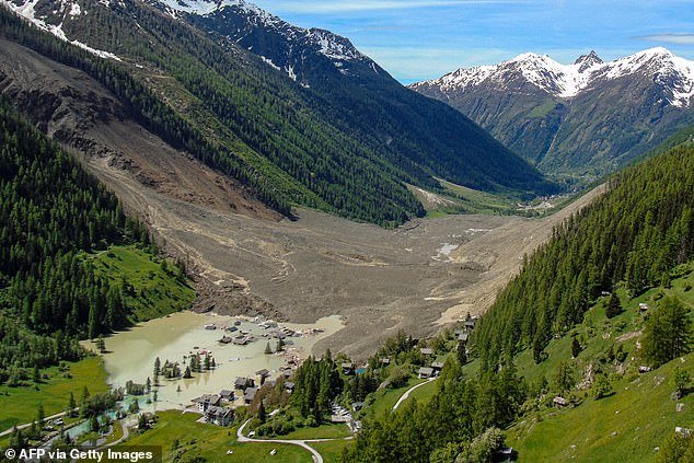 As novas imagens tiradas de um helicóptero no topo do Blaten colocaram a escala de destruição – e a possibilidade de seus assentamentos vizinhos poderiam enfrentar uma catástrofe.