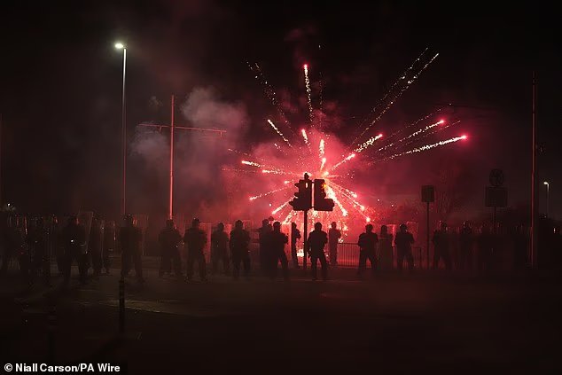 Os manifestantes jogaram fogos de artifício contra policiais perto do CityWest Hotel, enquanto o caos eclodia do lado de fora do hotel de Dublin que abrigava requerentes de asilo (Imagem: motins na noite de quarta-feira)
