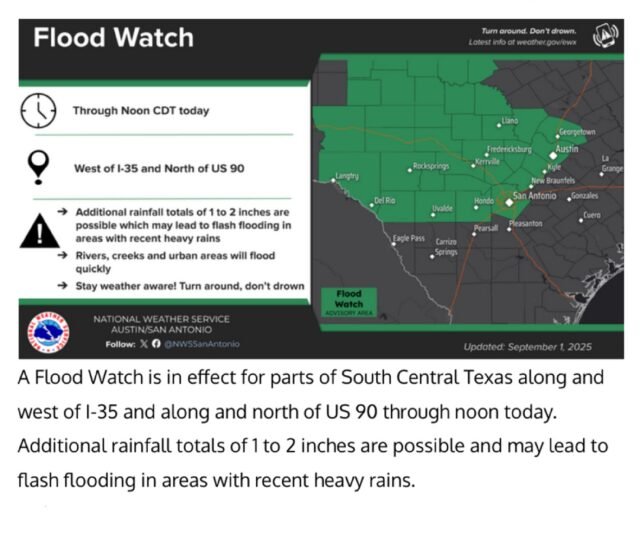 O relógio de inundação emitido pelo escritório do NWS Austin/San Antonio é eficaz na maioria dos casos no centro-sul do Texas até segunda-feira à tarde.