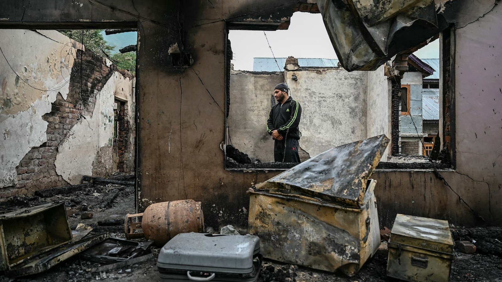 Um homem em pé dentro de sua casa, destruído pelos tiroteios em artilharia paquistanesa na vila de Salamabad em 8 de maio de 2025.