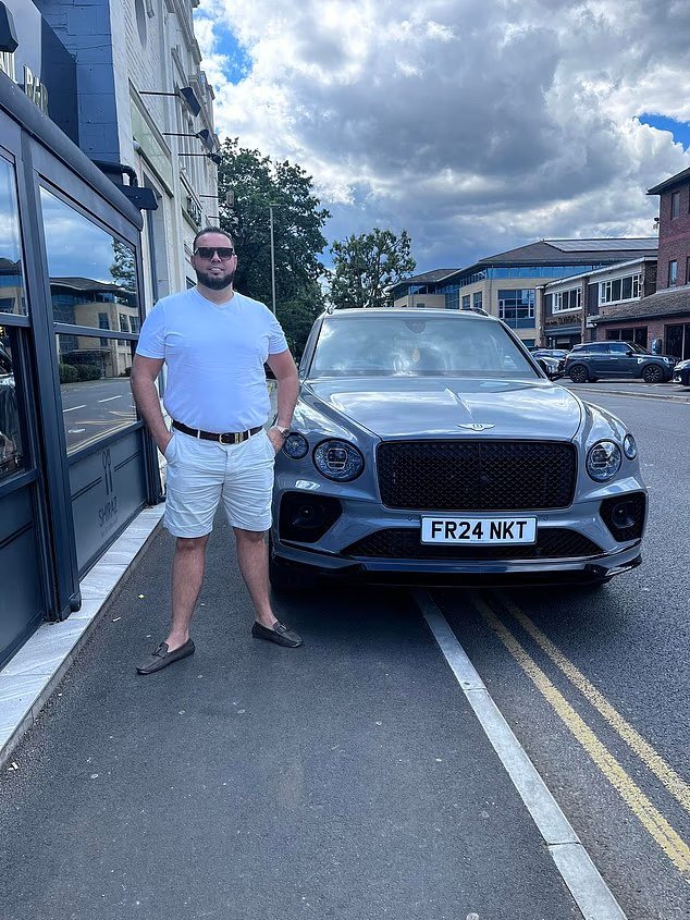 Frank Tomney pose com Bentley que parece mostrar placa de números personalizados